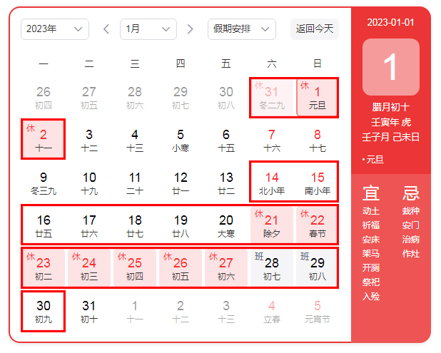 2023年1月14日(周六)-2023年1月30日(周一),共計(jì)17天,1月31日(正月初十)正常上班