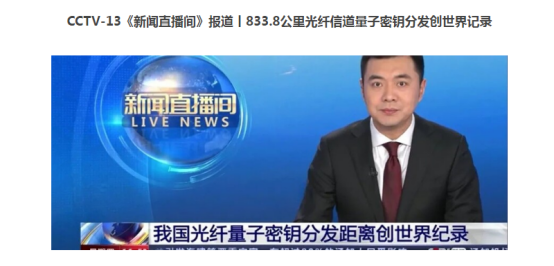 1月20日,中央電視臺(tái)新聞?lì)l道新聞直播間報(bào)道:中國(guó)科學(xué)技術(shù)大學(xué)郭光燦院士、韓正甫教授團(tuán)隊(duì)采用雙場(chǎng)量子密鑰分發(fā)協(xié)議在光纖中實(shí)現(xiàn)了833.8公里的量子密鑰分發(fā),再創(chuàng)無(wú)中繼光纖量子密鑰分發(fā)傳輸距離的世界紀(jì)錄