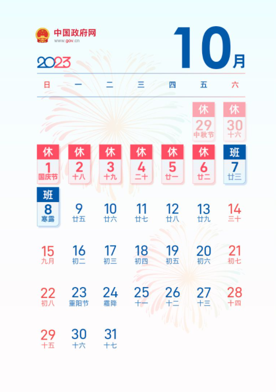 根據(jù)國務(wù)院辦公廳 通知 精神, 20 23 年 中秋、國慶節(jié) 從 9 月 29 日 (星期五) 至 10 月 6 日 (星期五) 放假調(diào)休 , 共 8 天。 10 月 7 日(星期六)、 10 月 8 日(星期日)上班。