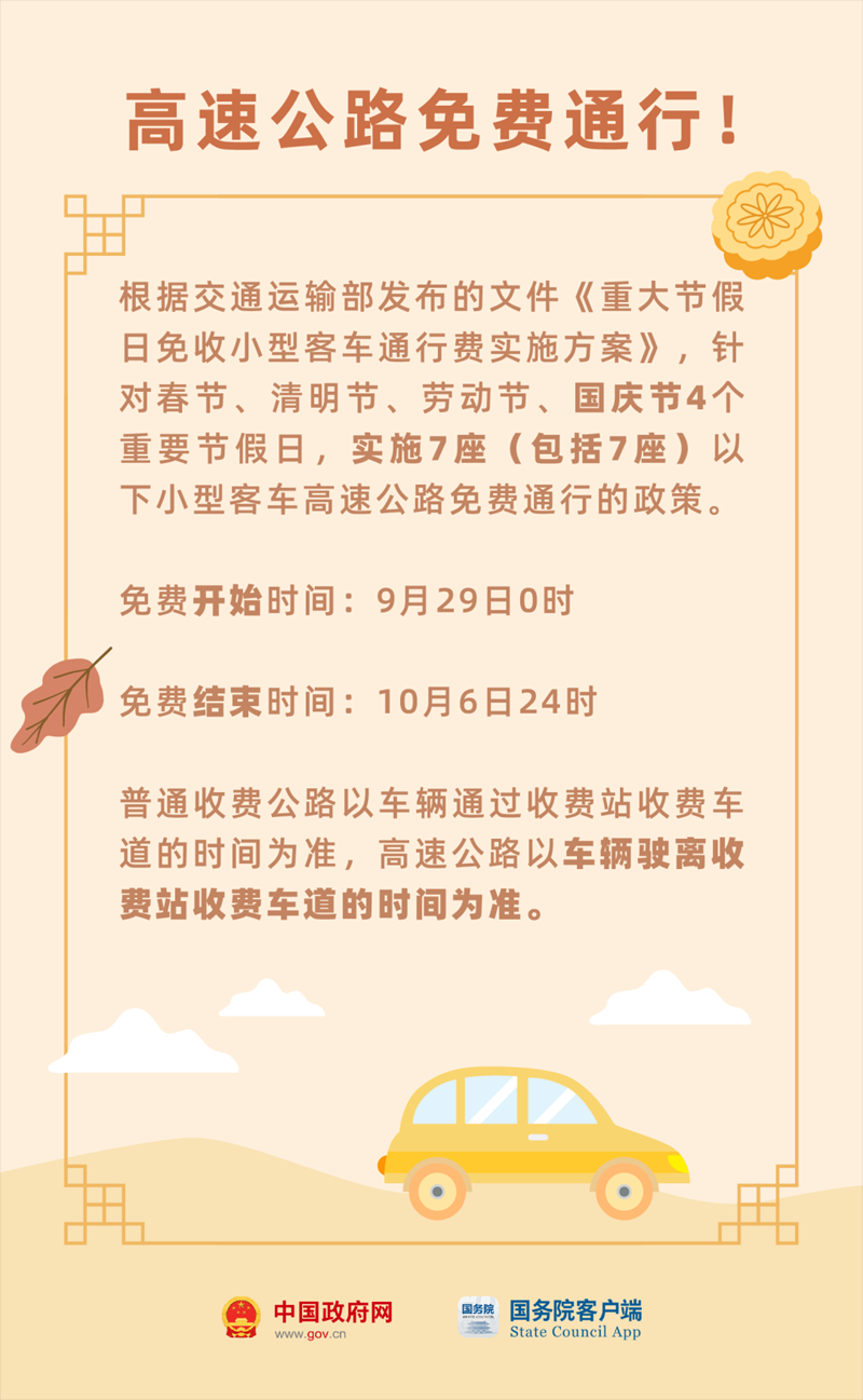 驚喜好消息:高速公路免費通行的節(jié)假日只有四個,分別是春節(jié)、清明節(jié)、勞動節(jié)和國慶節(jié),很顯然中秋節(jié)是不包括在免費之內(nèi)。但是2023年中秋國慶連休,所以今年高速是免費的。